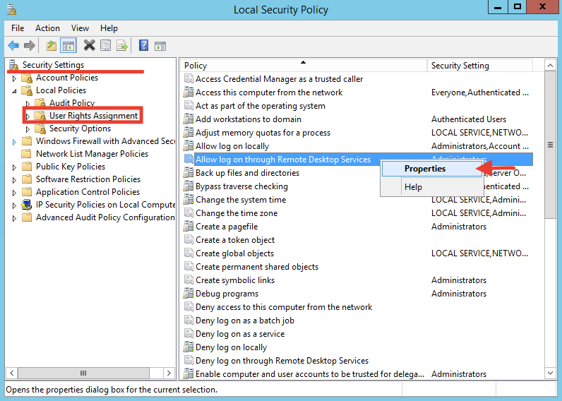 Sonra sırası ile Local Policies —> Use Rights Assignment —> Allow log on through Remote Desktop Services a sağ tıklayıp Properties i seçelim.