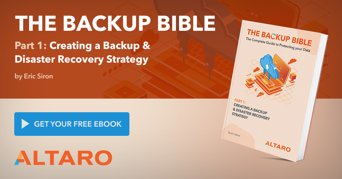 Altaro’nun ücretsiz bir eKitabı olan Backup Bible, önemli bir veri kaybı olayına hazırlanma, yanıt verme ve kurtarma aşamalarında size yol göstermektedir.