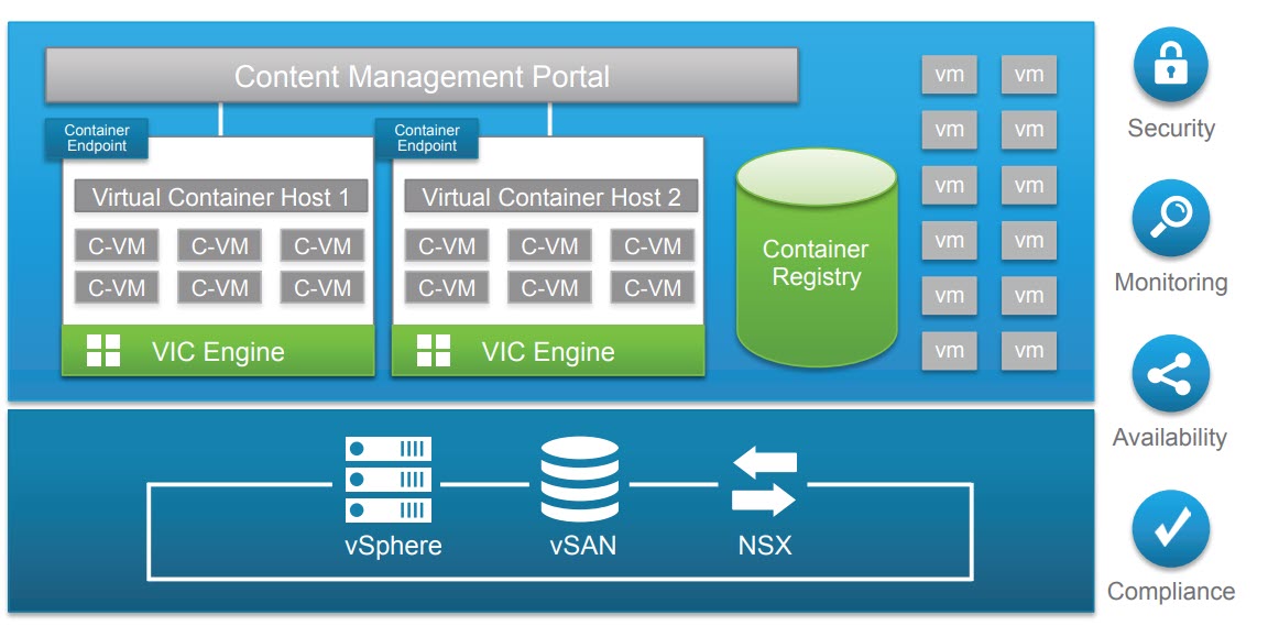 vSphere Integrated Containers üç ana özelliğe sahiptir: portal, registry ve engine. Portal, contanier yönetmek için bir kullanıcı arabirimi ve bir API,repositories, images, hosts,ve instances sağlamaktadır.