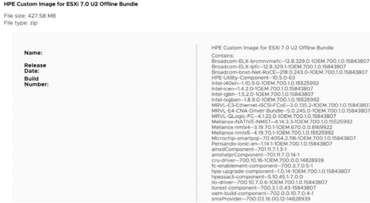 VMware’ın sitesinden HPE için hazırlanmış 7.0 U2 custom imajı indiriyoruz ve ekranda görüldüğü gibi imajın içinde i4 driver “1.10.9.0-1O” sürümü bulunmaktadır.