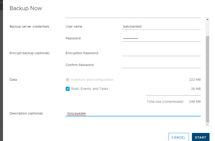 Data kısmında stats,events and tasks seçiyoruz. Description isim verdikten sonra start diyip tanımladığımız ftp adresimize backup’ı başlatabiliriz.