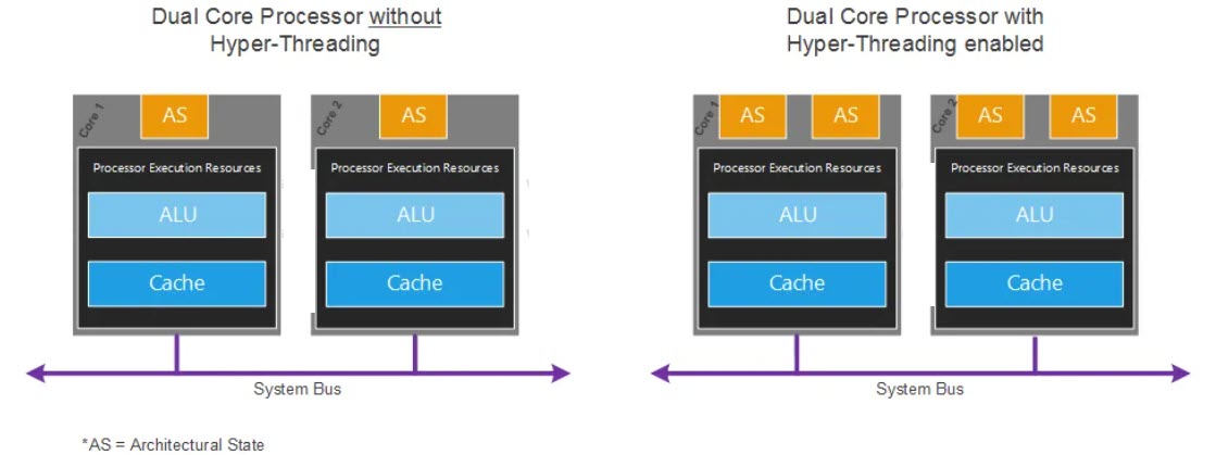Hyper-Threading Teknolojisi, Intel tarafından kullanılan tescilli bir terimdir, ancak genel terim Eşzamanlı Çoklu Okumadır (SMT). İşlemcinin bir fiziksel CPU’nun çekirdeği başına iki ayrı yürütme bağlamı planlamasına ve ayrıca her iki yürütme bağlamı arasında çok hızlı geçiş yapmasına olanak tanır. Bir hesaplama görevinin (iş parçacığı) yürütülmesi sırasında, diğer iş parçacığı bekleme durumuna geçer, bu, her iki mantıksal işlemcinin de aynı anda hesaplama görevini yürütmesi gerektiğinde, bir mantıksal işlemcinin görevi yürütmesi ve başka bir işlemcinin iş parçacığının ‘bekleme’ye gitmesi gerektiği anlamına gelir. durum ve tersi. Bu yüzden iki fiziksel çekirdekli işlemci kadar iyi performans göstermiyor.