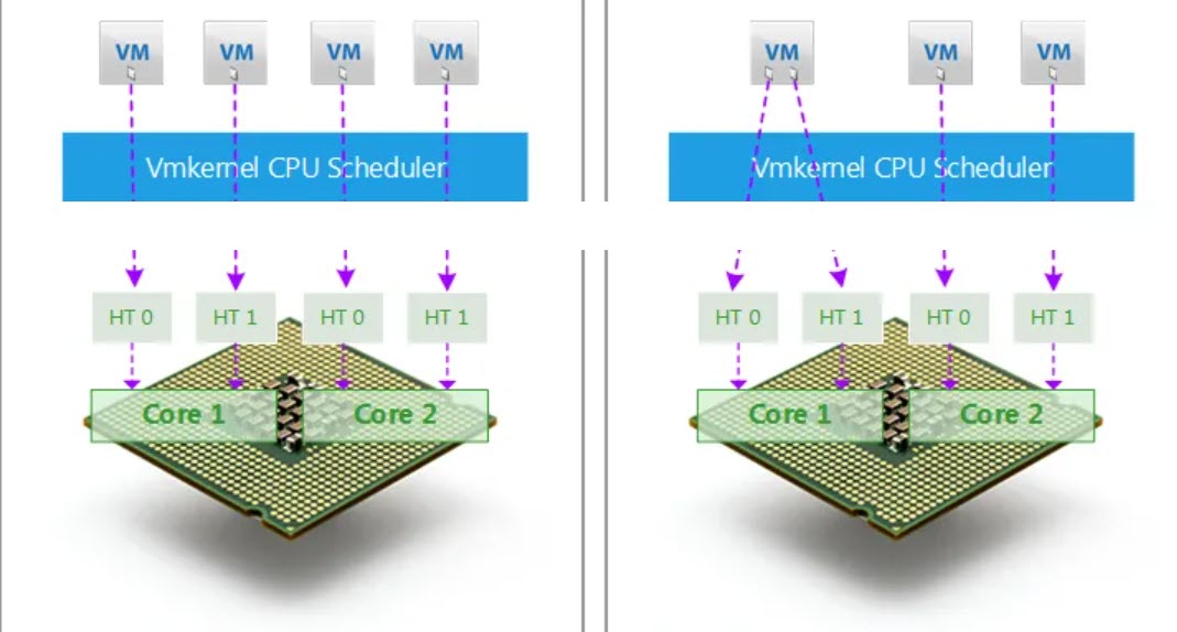 VMware vSphere’de, ana bilgisayarın BIOS’unda HT’nin etkin olup olmadığını görebilirsiniz. Yukarıdaki örnekte HT devre dışı bırakıldığında, yalnızca 2 mantıksal işlemci gösterecek, ancak HT’nin etkinleştirilmesi durumunda 4 mantıksal CPU gösterecek ve her birine 1 vCPU atayarak 4 sanal makine oluşturabilirsiniz. Bununla birlikte, 2 VM’ye 1-1 vCPU atayarak ve 2 vCPU’yu 1’e (aşağıdaki şekilde gösterildiği gibi) veya 2 vCPU’yu 2 VM’ye veya 1 VM’ye 4 vCPU vererek 1 VM’ye atayarak 3 VM de oluşturabilirsiniz.