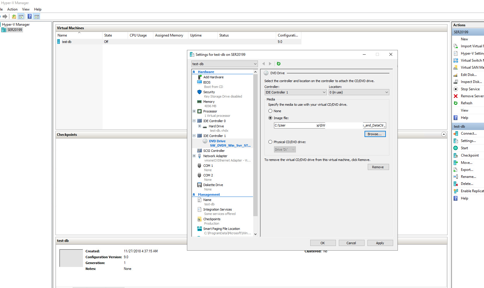 Oluşturduğumuz sunucu gözükmekte , üzerinde sağ tıklayıp edit settings bölümüne girerek IDE Controller1/DVD Drive / İmage File server 2016 iso dosyamızı gösteriyoruz. Ok diyerek sayfamızı kapatıyoruz.