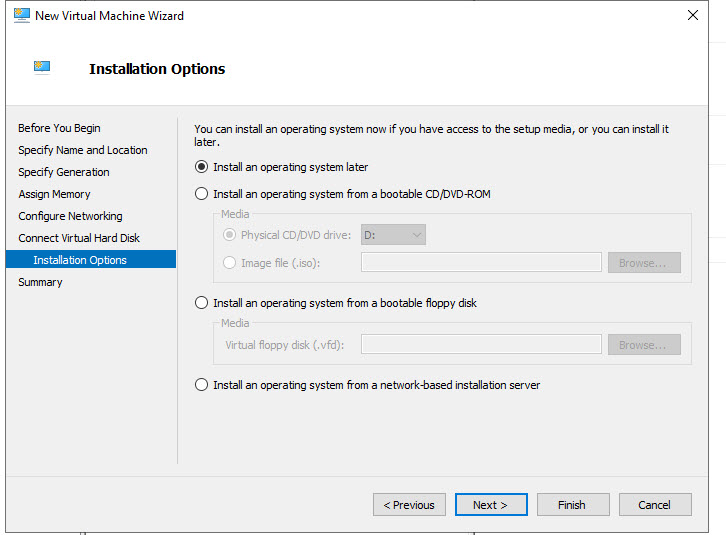 Installation Options kısmında , cd rom yani kurulum iso dosyamı daha sonra göstereceğim için , Install an operating system later’ı seçiyoruz.