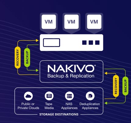 NAKIVO Backup & Replication, sanal, fiziksel ve bulut ve SaaS ortamlarını koruyabilen tam bir yedekleme ve kurtarma çözümüdür.