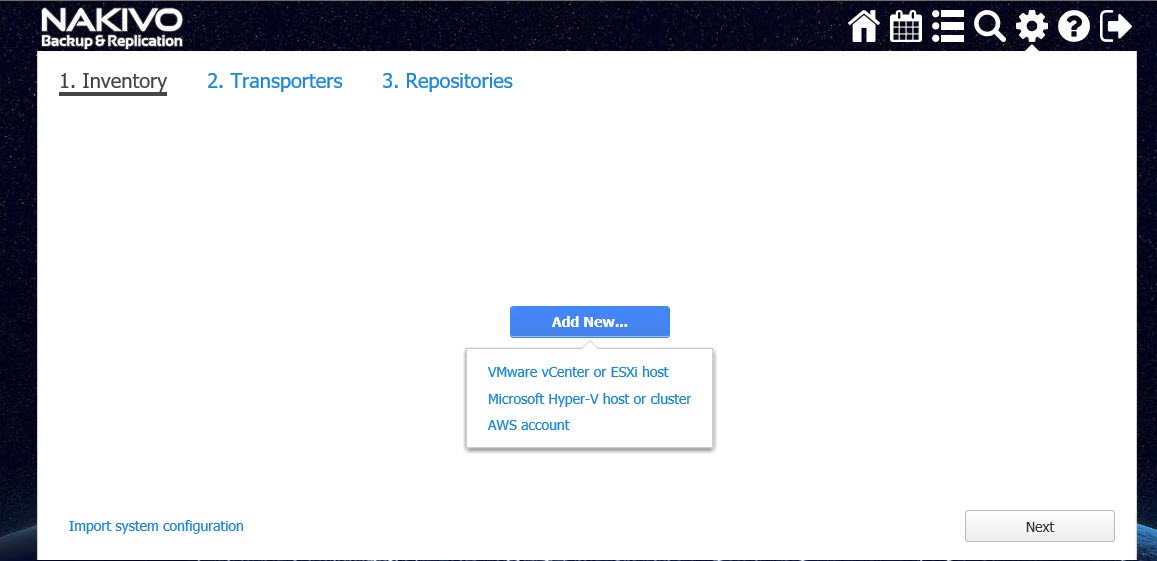Aşağıdaki resimde’de gördüğünüz üzere , Nakivo Backup Replication programına giriş yaptıktan sonra gelen Inventory Sayfasında Add New tıklayıp / Microsoft Hyper-V host or cluster’ı tıklıyoruz.