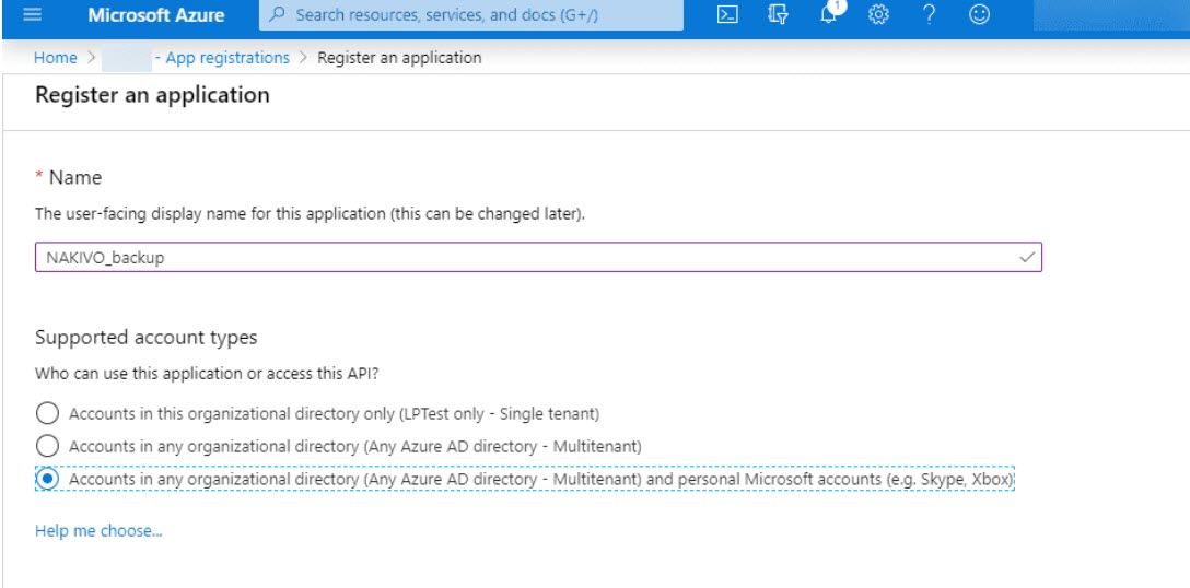 Uygulamayı adlandırın ve bu uygulamayı kimlerin kullanabileceğini veya bu API’ye erişebileceğini seçtikten sonra NAKIVO Account kısmından (Any Azure AD directory – Multitenant) ve seçilen kişisel Microsoft hesaplarını (örneğin Skype, Xbox) gösterir . Ardından Register tıklayın.