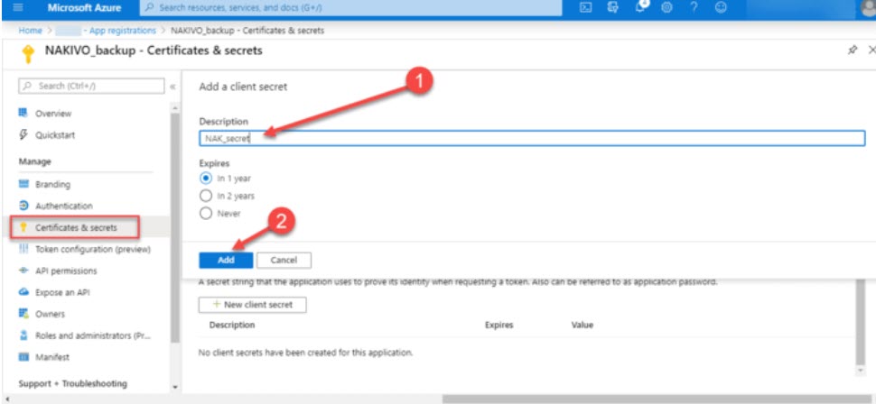Bunu yapmak için, Certificates & secrets button ve ardından Yeni istemci tıklayınız.