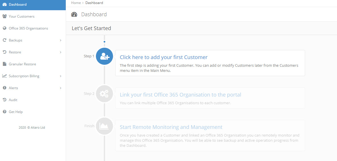Yönetimi ve kullanımı oldukça basittir. Buradan kayıt olduk’tan sonra bizlere bir dashboard sayfası gelecektir. Go to Altaro Office 365 Backup’ı tıklayıp, backup’lamayı başlatacağız.