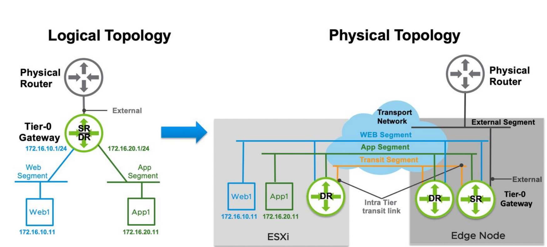Yukarıdaki yapıda görüldüğü üzere genel routing mimarisi T0, T1 router ve segment instance’lardan oluşmaktadır. Burada DR distributed router anlamına gelmektedir ve T1-T0 DR tüm transport nodelarda bulunabilmektedir. Bu durumda DR oluşturmak için Edge Cluster gerekmemektedir.