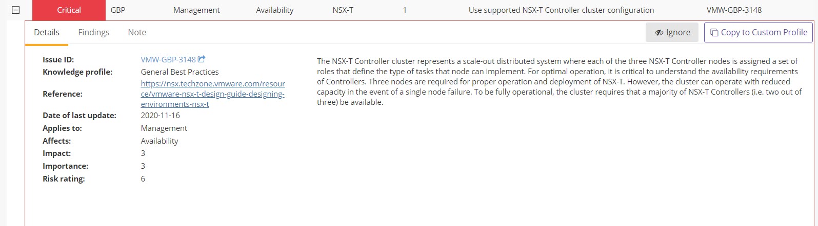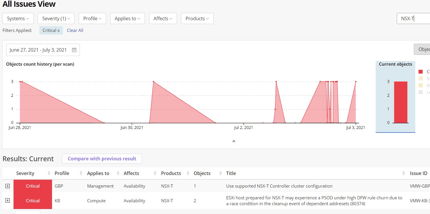 Runecast sayfamıza giriş yaptıktan sonra All Issues View bölümünde NSX-T ile ilgili alarmları görebiliriz. İki adet critical alarm mevcut olarak gözükmektedir. Runecast Analyzer ortamınıza müdahale etmemekle beraber, aynı zamanda sizlere bir yol göstericisidir.