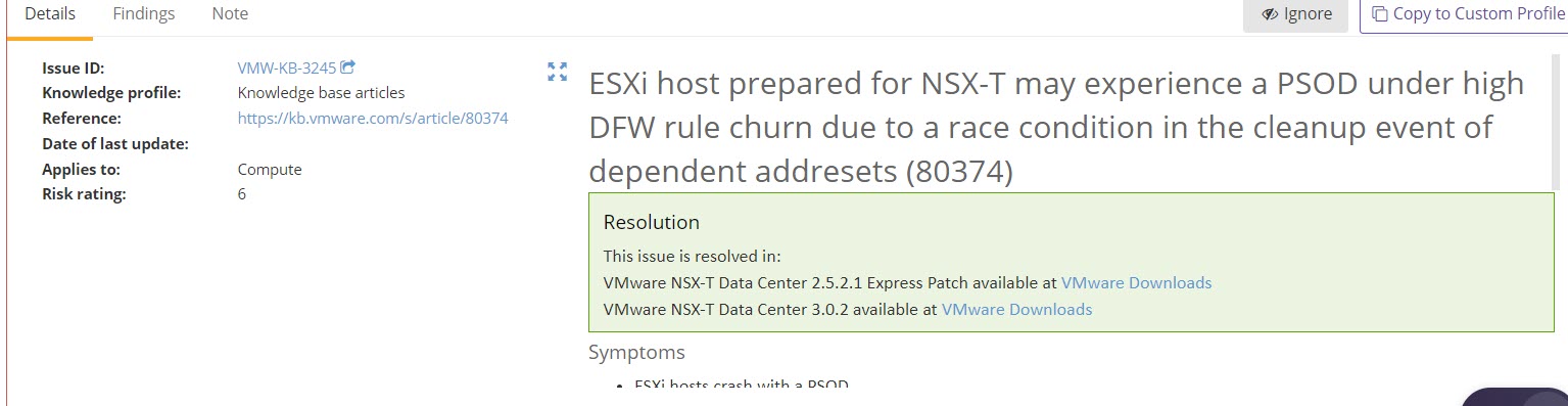 Diğer Critical alarm’da ise gerekli yamayı geçmemizi söylemektedir. Eğer geçmez isek ortamı PSOD(mor ekran) düşmüş şekilde görebilirsiniz. Burada özellikle yamanın önemini vurgulamakta ve VMware Best Practice uyumlu çalışması için gerekli yamayı geçmenizi önermektedir.