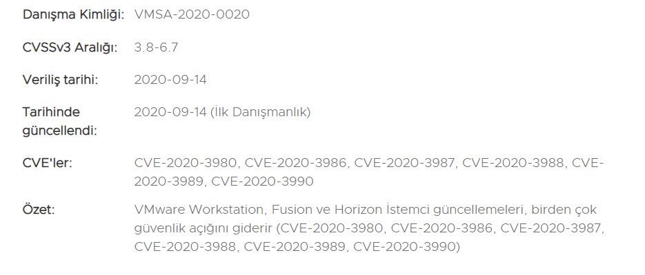 VMware Workstation, Fusion ve Horizon Client’taki birden çok güvenlik açığı özel olarak VMware’e bildirildi. Etkilenen VMware ürünlerindeki bu güvenlik açıklarını gidermek için güncellemeler mevcuttur.