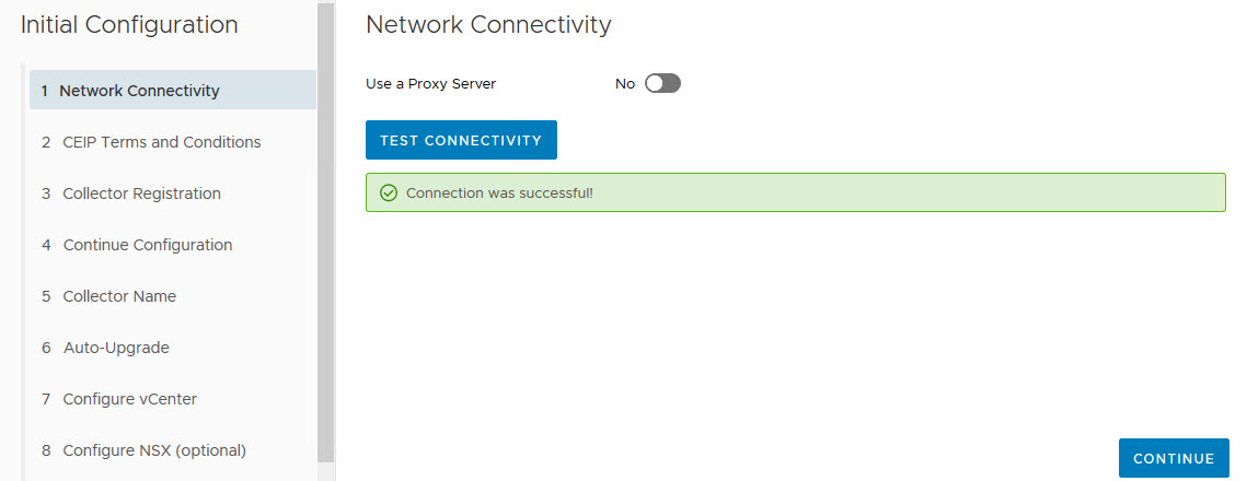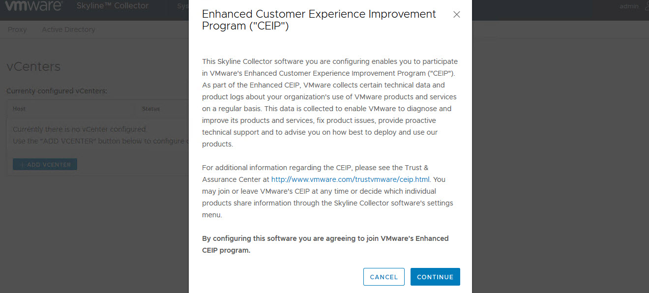 Skyline Collector vCenter’ımızı eklemek için , sayfamıza giriş yaptıktan sonra üst menüde bulunan vCenters’ı tıkladıktan sonra karşımıza CEIP (Müşteri deneyimi iyileştirme programı) continue diyerek devam ediyoruz.