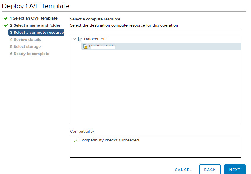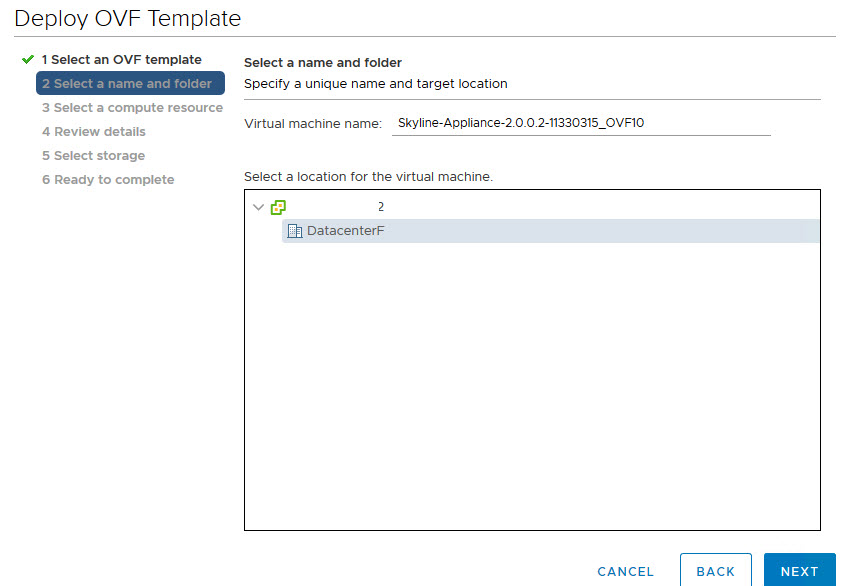 Select a name and folder bölümün’de ise ilgili datacenter’ımızı seçiyoruz ve devam ediyoruz.