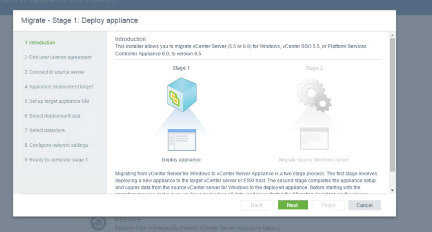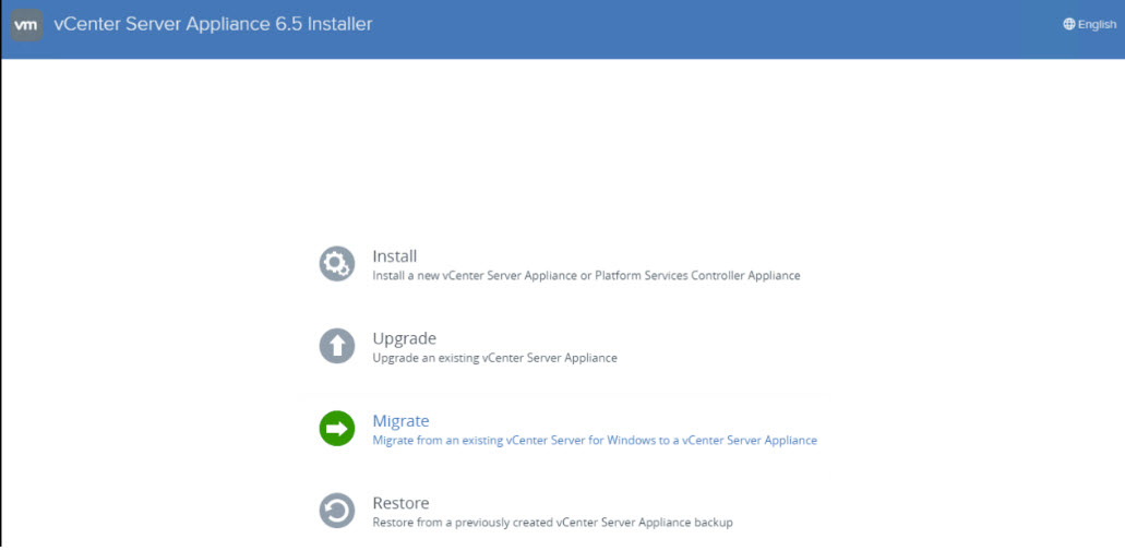VCenter Server Appliance 6.5 iso’nun içindeki migration asistanı klasörünü yerel olarak Windows vCenter Server 6.0’a kopyalanabilir veya doğrudan iso’dan da çalıştırılabilirsiniz.