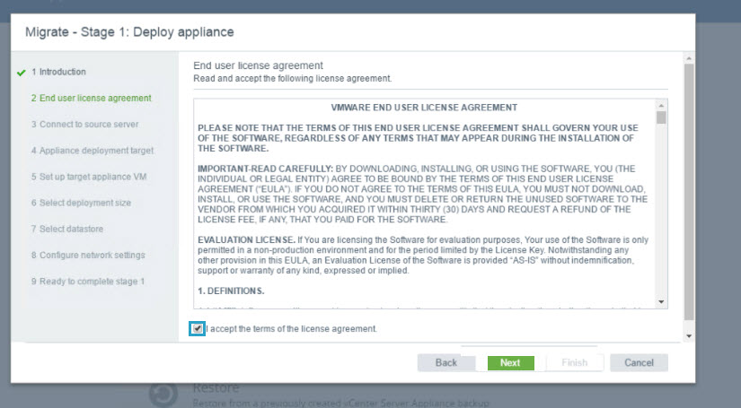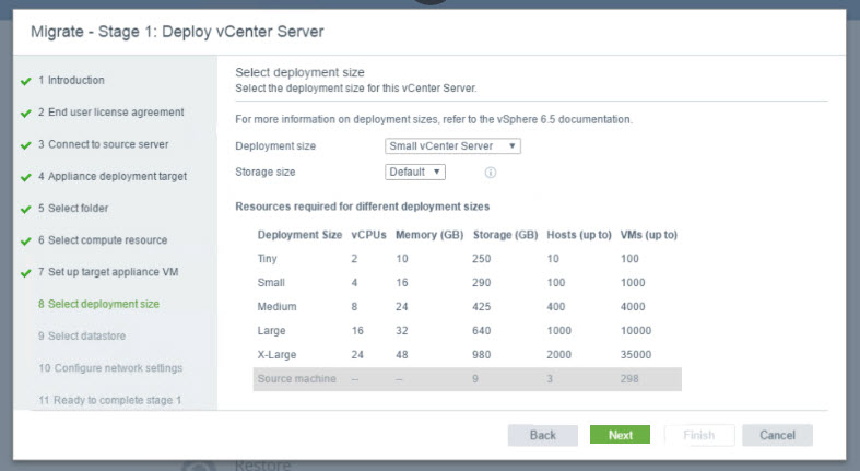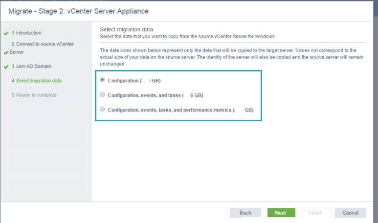 Buradan , Windows vCenter Server 6.0’dan vCenter Server Appliance 6.5’a hangi verinin taşınacağını seçiyoruz. Varsayılan olarak vCenter Sunucu yapılandırması, envanteri ve alarm verileri taşınır.