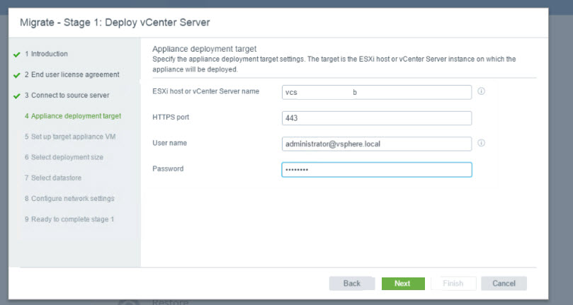 vCenter Server 6.0 tam etki alanı adı (FQDN) veya IP adresi ve vSphere Oturum Açma parolasını girdikte sonra next diyerek devam ediyoruz.