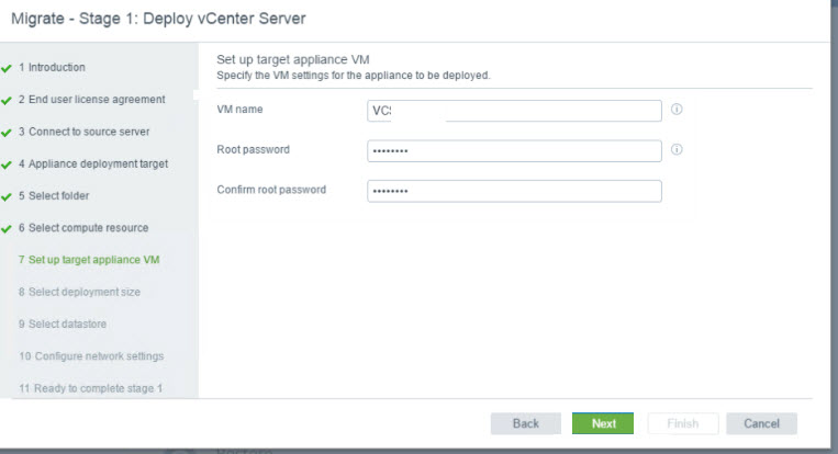 Kurulacak olan hostumuzu seçerek next diyerek devam ediyoruz.VCenter Sunucu Apliance için bir VM adı ve şifre belirledikten sonra next diyerek devam ediyoruz.