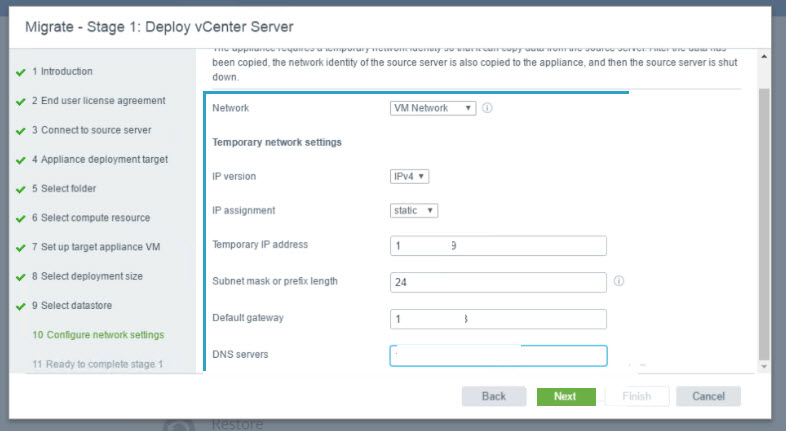 Kurulacak olan datastore’muzu seçtikten sonra next diyerek devam ediyoruz. Configure network settings’te network ayarlamızı yapılandırtıktan sonra next diyerek devam ediyoruz.