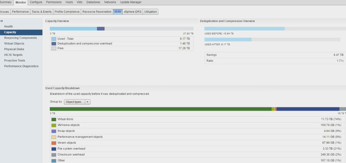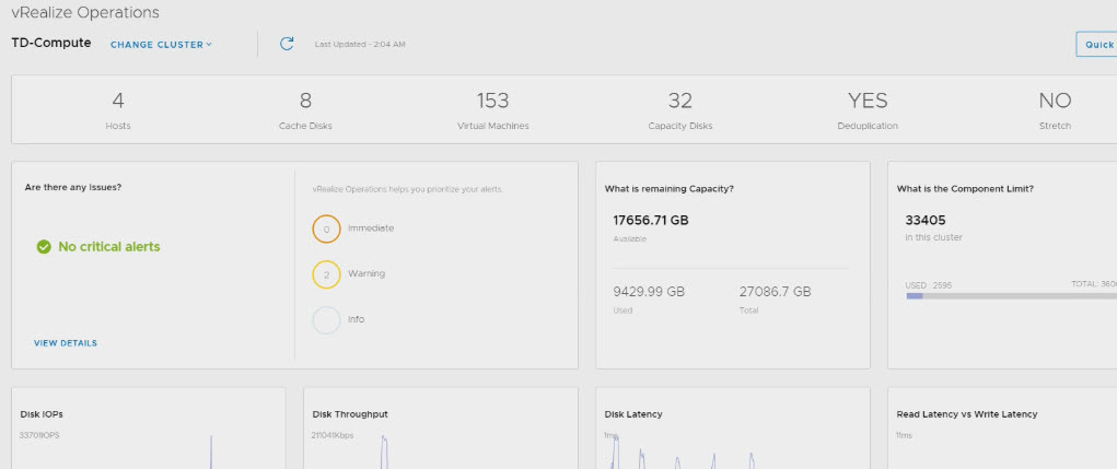 Gösterge Tabloları’nı ve ardından vSAN Kapasiteyi seçebilirsiniz.. vROps, yöneticilerin sanallaştırılmış ortamlarındaki sorunları hızlı bir şekilde tanımlamasına yardımcı olmaktadır. Genel dashboard bize tam olarak neleri bilmemiz gerektiğini söyler; vSAN kümesinin kapasitesi ve kullanımını verimli kullanmamızı sağlamaktadır.