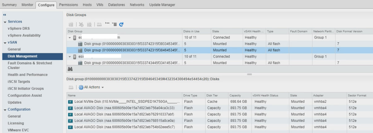 Daha Configure>vSAN>Disk Management’dan Esxi disk grubundan birini tıklıyoruz. Bir ESXi host’un ayrı disk grubunu seçerek, o disk grubunun ayrıntıları alt bölmede doldurulur. Bu vSAN kümesinde, her biri (2) disk grubuna sahip (4) ESXi host bulunur. Her disk grubunda 750GB SSD cache disk ve (4) 960GB SSD kapasiteli tier diskleri bulunmaktadır.