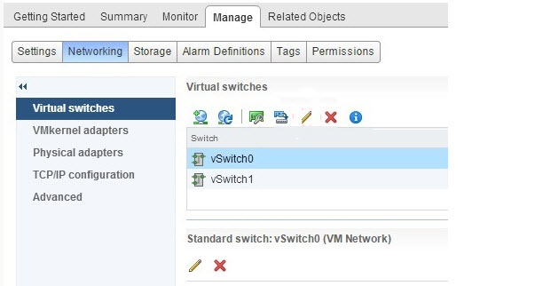 Hostumuzu seçtikten sonra Manage – Networking gidelim. Değiştirmek istediğiniz sanal switch seçelim ve ayarları düzenle simgesini tıklayalım.