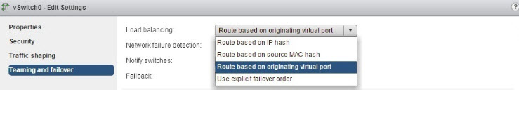 Aşağıdaki resimde görüldüğü gibi , vswitch 0 ‘ı seçtikten sonra edit settings Teaming and failover tıkladığımızda sağ tarafında Load Balancing’in alt menüsünde yük dengeleme menüleri gözükecektir.