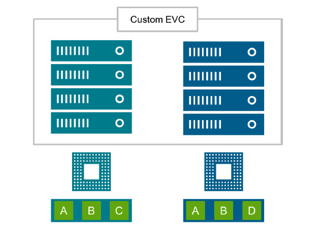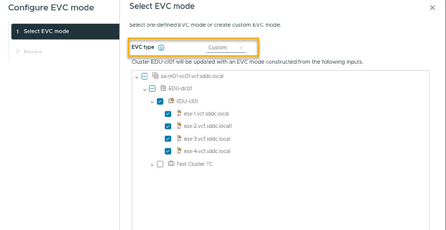 CPU özelliklerini tek tek seçerek kişiselleştirmenizi,Cluster içindeki host’ların ortak desteklediği instruction set’lere göre esnek bir EVC seviyesi oluşturmanızı, Sadece belirli host gruplarına uygulanabilmesini sağlar. Yani custom EVC, hazır şablonlara bağlı kalmadan tamamen size özel bir CPU uyumluluk seviyesi oluşturma yeteneğidir.