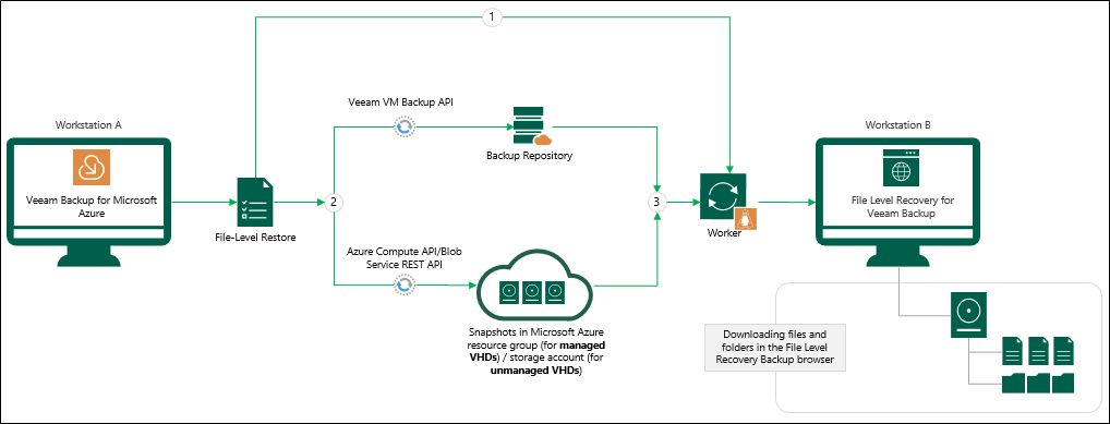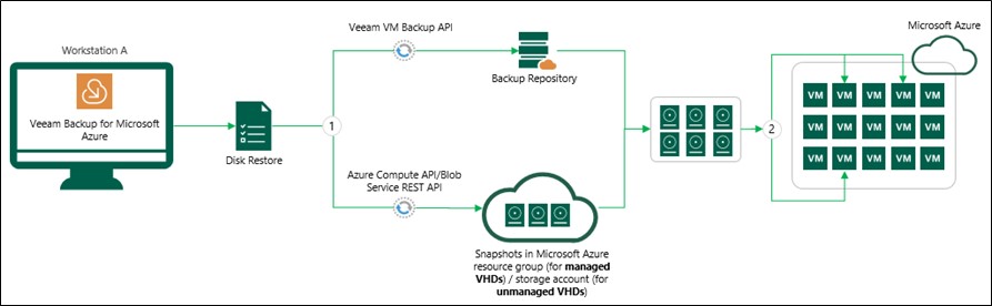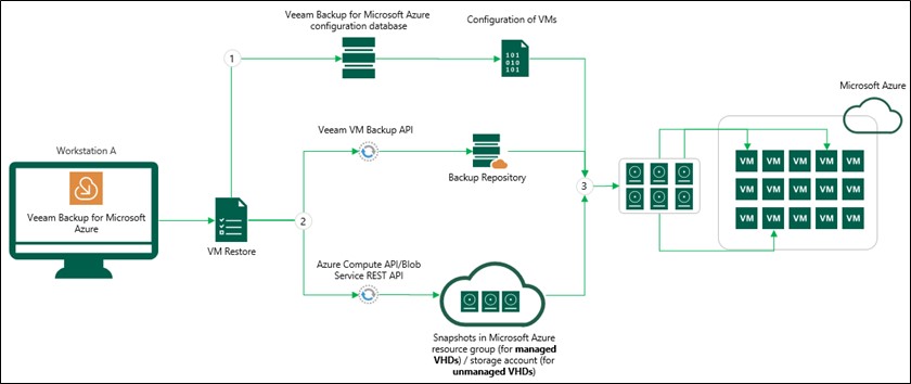 Her bir VM’nin VHD’lerini anlık görüntü veya yedekleme yoluyla kurtarır, neyin depolandığına veya geri yükleme sırasında neye bağlı olduğuna bakmaktadır. VHD’leri veya Veeam’i kurtarmak için aşağıdaki API’leri kullanabilirsin: