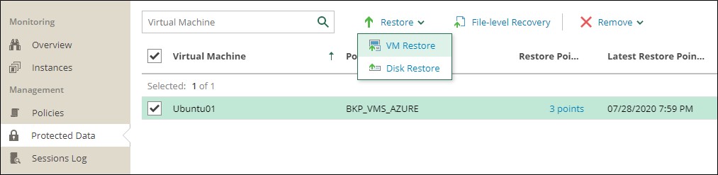 Konsola giriş yaptıktan sonra Protected Data > VM Restore tıklayınız.