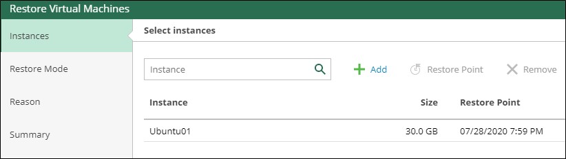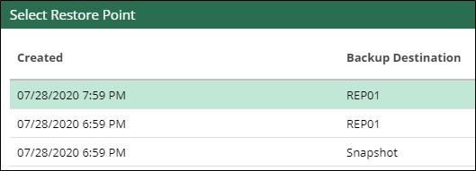 Geri yüklemek istediğiniz sanal makinelerin yanı sıra kullanmak istediğiniz geri yükleme noktasını seçmek için hiçbir sihirbaz mümkün değildir.