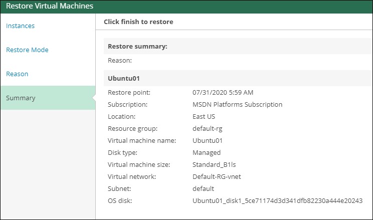 “Geri Yükleme Modu” nda, orijinal yerel veya farklı ayarlarla (VM adı, Abonelik, Kaynak Grubu, vb.) Yeni bir yerel için geri yükleme seçeneği arasından seçim yapabilirsiniz. Nesne, “Orijinal konuma geri yükle” yi seçerseniz, test etmek veya yedeklemek için VM’yi silebilirsiniz.
