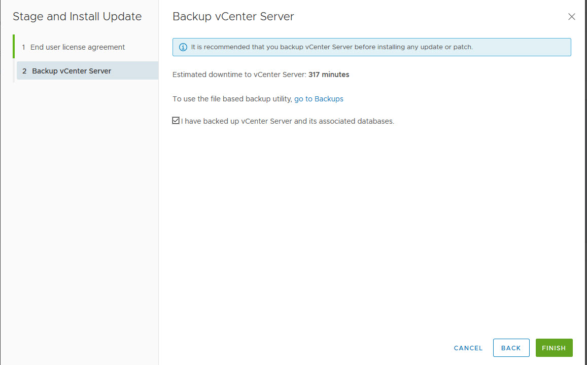 Backup vCenter Server , ortalama update saniyesini söylemektedir. (I have backed up vCenter Server and its associated databases) , update öncesi verilerini yedeklediyseniz , check ile işaretledikten sonra finish butonuna basıyoruz.