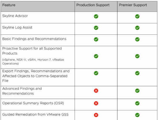VMware Skyline, Production veya Premier desteği olan tüm müşteriler tarafından kullanılabilmektedir. Bazı modüller yalnızca İşletme düzeyinde desteği olan müşteriler tarafından kullanılabilmektedir.