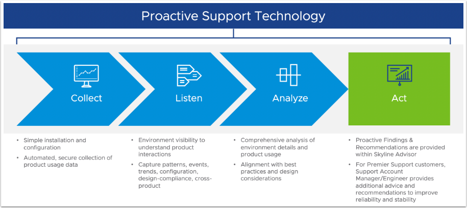 VMware Skyline, çevreyi proaktif bir şekilde izlemek için bir Topla, Dinle ve Analiz Et yaklaşımını izlemektedir. Bu yaklaşım sırayla VMware ortamınızın bazı bölümlerinde planlanmamış olası kapalı kalma sürelerini önlemenize yardımcı olmak için zamanında ve uygulanabilir bilgileri sağlamaktadır.