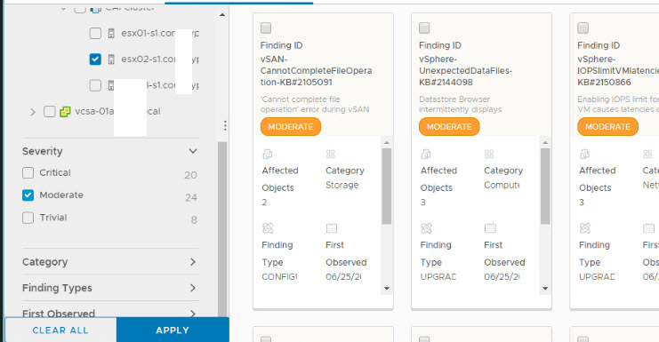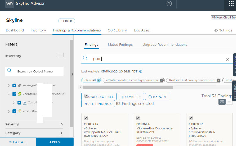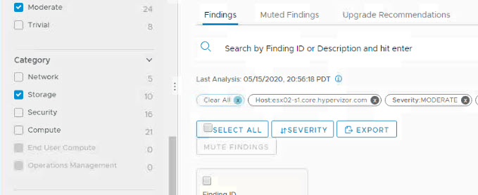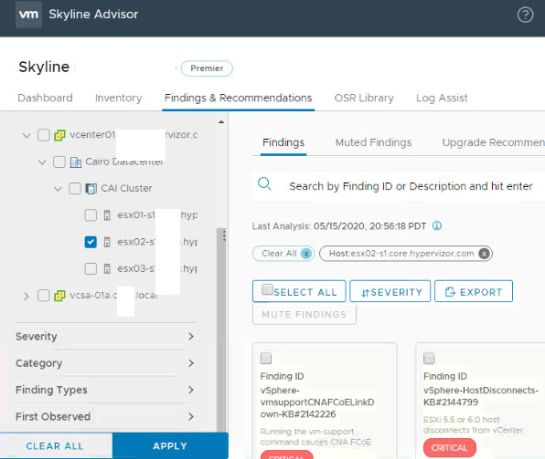 VMware Skyline çok güçlü bir arama özelliğine sahiptir. Görüntülenen bulguları aradığımız belirli bir soruna daraltmak için arama işlevini kullanabilirsiniz.