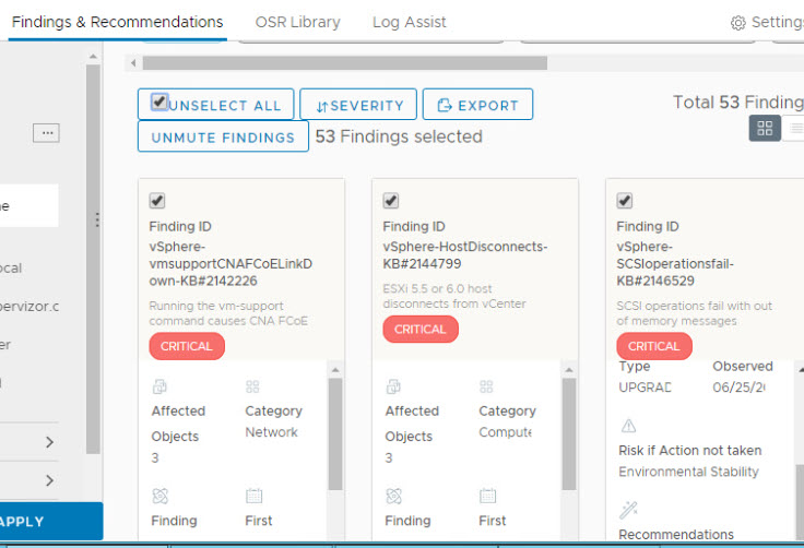Findings yani Bulgular Sekmesi, VMware Skyline’ın izlediği ortamda keşfedilen tüm tanımlanmış sorunları, bilinen hataları ve yanlış yapılandırmaları görüntülemektedir. Bu sorunlar varsayılan olarak bir kart stili biçiminde görüntülenir. Tek bir sayfada daha fazla bulgunun görüntülenmesini sağlamak için ekran, listeye dayalı bir görünüme değiştirilebilir.