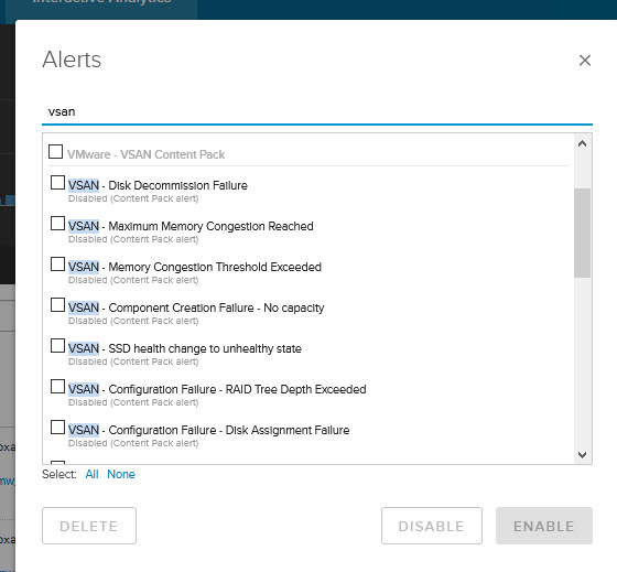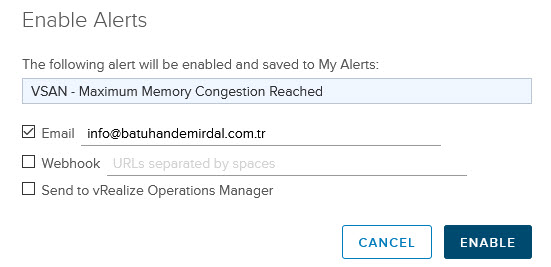 Burada vRealize Log Insight’a gelen VSAN 2.1 paketindeki yeni özellik olan VSAN-Maximum Memory Congestion Reached (Maksimum Hafıza Sıkışıklığına Ulaşıldı) check ile işaretledikten sonra Enable diyerek alerts sayfamıza geçmiş oluyoruz.