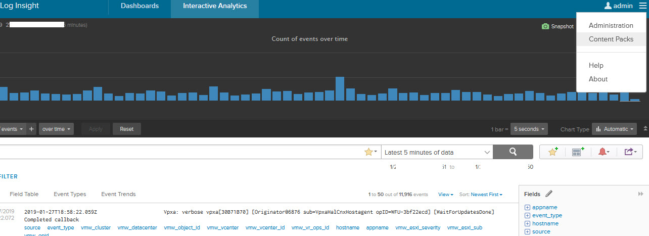 Giriş yaptıktan sonra karşımıza Dashboard sayfası gelecektir , sağ üstte bulunan Interactive Analytic tıklayalım. Tıkladıktan sonra sağ tarafta bulunan admin / Content Packs tıklayıp VSAN 2.1 paketini indirelim.