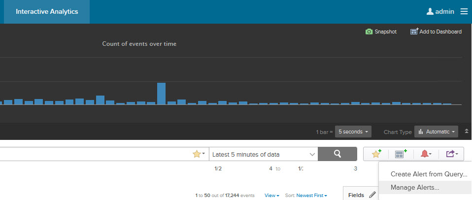Alert oluşturmak için, üst menüde bulunan Interactive Analytic sayfamıza gidiyoruz. Bu sayfada sağ alt tarafta bulunan alarm zilini tıkladığımızda Manage alerts diyerek indirdiğimiz paketinin alarm yapılandırmasını yapmış olacağız.
