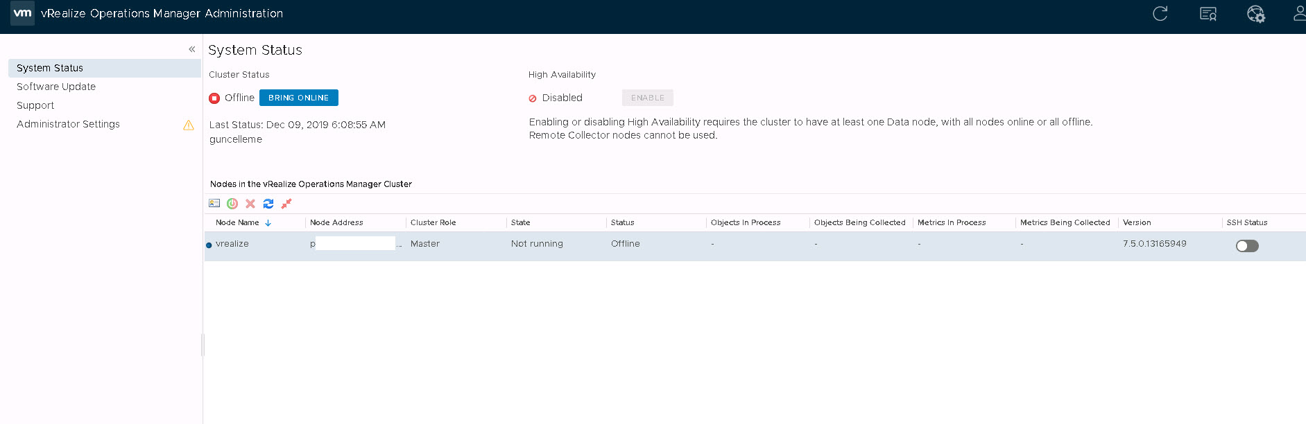 Parolamızı değiştirdikten sonra update işlemi tamamlanacaktır. System status bölümünden vRealize Operations Manager’ı Online durumuna getirmeyi unutmayın.