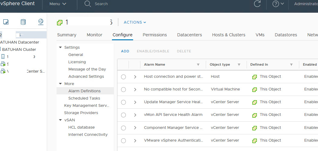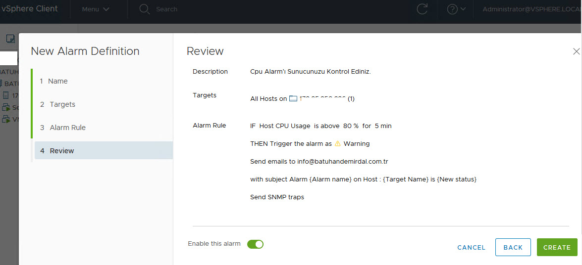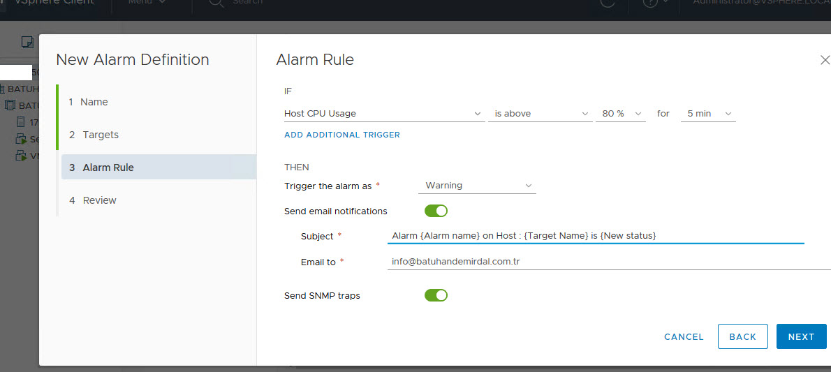 Merhaba değerli arkadaşlar, bu makalede vSphere 6.7 ‘de alarm oluşturmayı anlatacağım. Disk dolduğunda,Cpu yükseldiğinde veya sunucunuz power off olduğunda ve buna benzer birçok çeşit bilgilendirme maili tanımladığınız adrese gönderecektir.