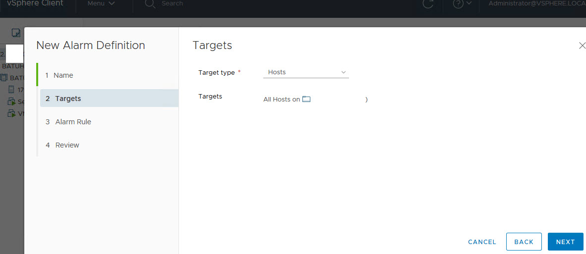 Target Type bölümünde , ben hostum üzerinden CPU alarm’ı alacağım için Host’umu seçiyorum. Targets’da ise ilgili hostumuzun ip’si gözükmektedir.