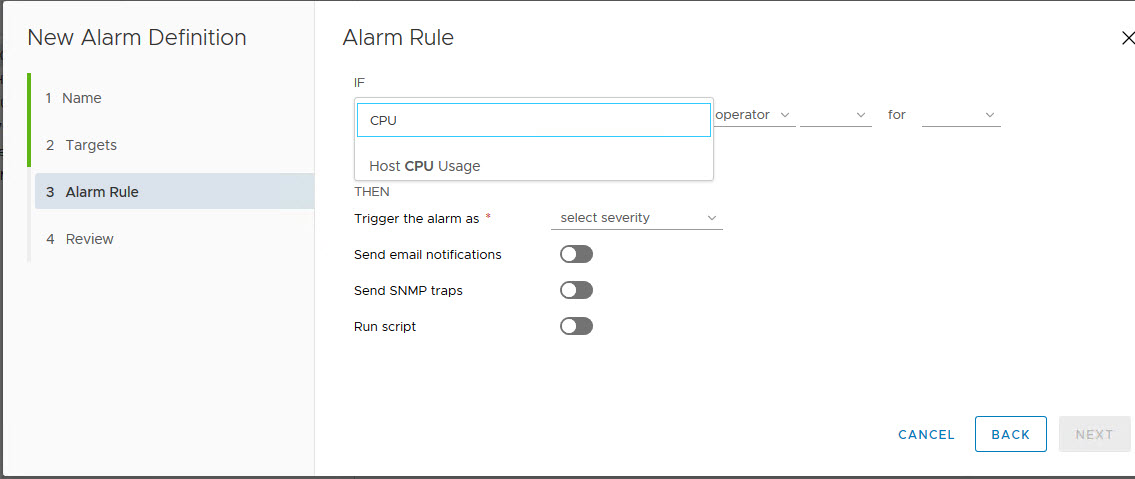 If bölümüne Cpu yazdığımda Host CPU Usage kullanım bilgisi gelecektir. Cpu alarm’ı olacağından ben bunu seçiyorum.Next diyerek devam ediyoruz.