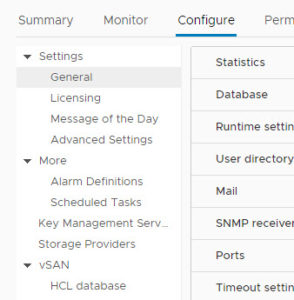 Yukarıda resimde’de belirttiğim üzere öncelikle smtp ayarlarını yapmamız gerekmektedir. vSphere Client Web’e giriş yaptıktan sonra, vcenter’ımızı tıkladığımızda sağ tarafta Configure tab / select General/edit diyerek mail ayarlarını type smtp’sini belirliyoruz.