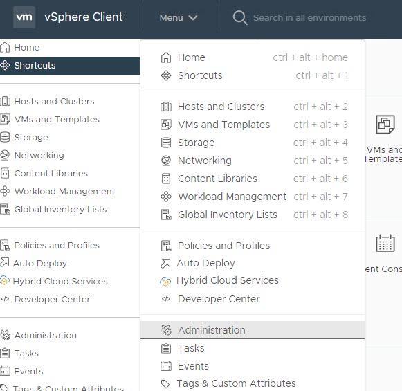 VMware vSphere 7.0 U2 ve ESXi 7.0 Lisans Eklemek için vSphere sayfamızı açıyoruz ve Home üzerinden Administration menüsüne giriş yapıyoruz.