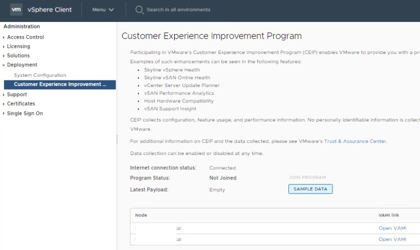 CEIP’nin etkinleştirilmesi birkaç farklı yolla gerçekleştirilebilir. VSphere İstemcisinden, bir vCenter Sunucu Geçişi veya Yükseltmesi sırasında ya da CLI’den. En kolay yol, bunu sadece vSphere İstemcisi aracılığıyla yapmaktır. Home > Administration CEIP altında etkinleştirebilirsin.