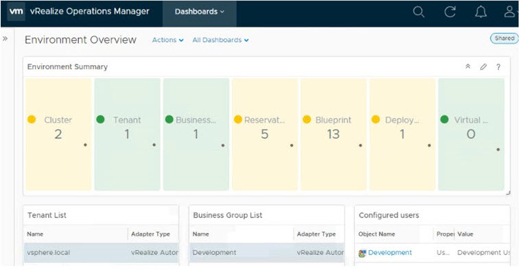 vRealize Automation Inventory: Mevcut nesneleri görüntülemek için bu widget’ı kullanılır ve dağıtılan her bir vRealize Otomasyon çözümü içindir.